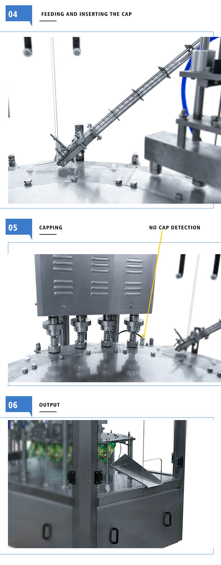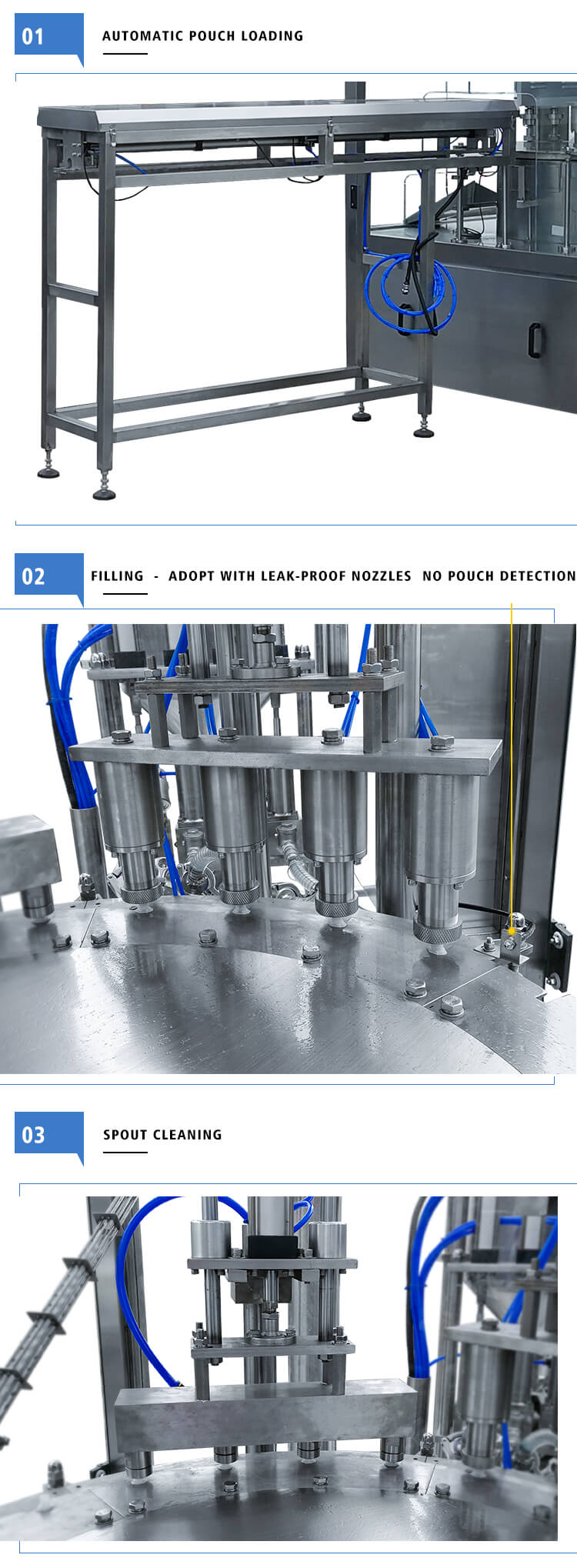 • Food grade 304# stainless steel is used in our spout pouch filling capping machine