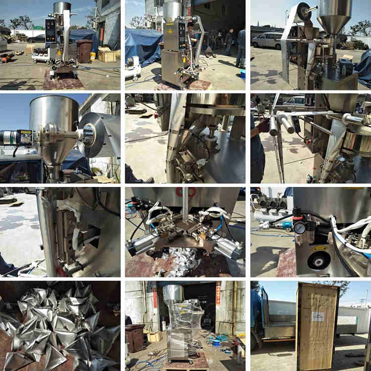 The machine is suitable for the triangle bag solid packing of grain, powder, liquid, short strip, and slices, such as slices puffed food, shrimp strip, peanut, popcorn, oatmeal, melon seeds, flavoring and so on.