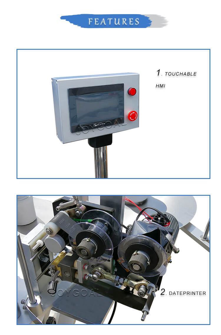 The machine can label the single-side of a round bottle, dual-side and tri-side of the square bottle; single-side and dual-side of a flat bottle. The machine is suitable in such industries as food, medicine, wine, oil and cosmetics etc.